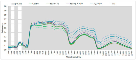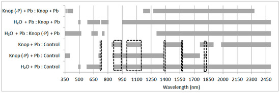 Lead toxicity on photosynthesis has often been examined with various species but rarely or not at all with ecotypes or populations all [65]. The generally accepted view is that heavy metals cause a reduction in photosynthesis in leaves primarily through induction of stomatal closure rather than a direct effect on light or dark reactions [20]. The lead treatment of pea plants resulted in statistically significant changes in the condition of the peas. The ANOVA performed for all the samples indicated that the presented ranges of the electromagnetic spectrum (Figure 3 and Figure 4) were statistically significant at the significance level of 0.001 (the most sensitive to the effects of heavy metals in the case of lead). In the figures, the marked grey ranges are the sensitive range for pigments and water content (the statistically significant changes depending on the medium in which the plants were grown: control; Knop + Pb; Knop (-P) + Pb; distilled water + Pb; at the p < 0.001). In the case of plants treated with the lead, the red-edge is noticeably, indicating damage to the cell structures of plants (Figure 3). In the plants growing in distilled water with lead, we perceived that the changes were noticed for 480–515 nm and 540–720 nm (responsible for absorption of light by chlorophyll. For Knop + Pb and control plants the following spectral ranges were significantly important: 710–735, 830–950, 995–1145, 1385–1570, 1760–1902, and 1980–2500 nm (responsible for water absorption). In contrast to ranges obtained for plants from Knop (-P) + Pb and control plants, also 850–1400, 1570–1760 and 1800–1830 nm indicated water absorption features (Figure 4). The differences occurred in the ranges: 714–723, 858–951, 995–1145, 1386–1389, 1570–1579, and 1801–1829 nm (marked with a black dashed line in Figure 4).