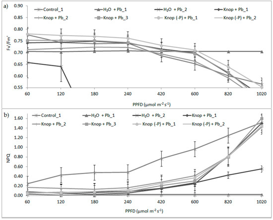 The results represent the fluorescence parameter values obtained for the different variants of pea leaves, using light intensities of 60,120, 180, 240, 420, 600, 820, and 1020 µmol photons·m−2s−1 (Figure 5). When leaves of high- or low-light-grown plants are exposed to other environmental stresses, a pronounced and sustained increase in energy dissipation may be induced, which could largely account for the change in photochemical efficiency. It is not clear whether the growth light conditions can modify the response of plants to heavy metals. We measured the quantum efficiency of PSII (Fv’/Fm’) and non-photochemical quenching of fluorescence (NPQ) in the light. The results show that the the maximum quantum efficiency of PSII (Fv’/Fm’) was significantly reduced in the presence of lead (Figure 5). At the higher light intensities above 400 μmol photons·m−2s−1, we observed slightly decreased photosynthetic efficiency (by about 4% to 8%), which was also confirmed by a significant difference in SIPI values, indicating the amount of light used in the photosynthesis process for peas growing in H2O + Pb and Knop (-P) + Pb medium was statistically significantly different compared with the control. Maximal photosynthetic efficiency (Fv’/Fm’ of ~0.78) was observed for control plants. We observed that in the Pb-treated plants in the range of light intensity from 60 to 600 μmol photons·m−2s−1, heat emission (NPQ) significantly reduced, but increased significantly at higher light intensities. This may indicate participation of carotenoids in the NPQ process. This was confirmed by a significant difference in the values for remote sensing CRI1 and ARI1 indices, which indicate the amount of carotenoids and anthocyanins, respectively. For peas grown in H2O + Pb and Knop (-P) + Pb medium, these indices showed a statistically significant change compared with the control. In control plants, NPQ was higher than in Pb-treated plants; thus, heat emission protects photosynthesis components and systems when light absorption is maximal.