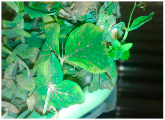 Important for research on the impact of lead and heavy metals on peas is the environment in which the plant grows, both in terms of the soil and the nutrient medium. In our study, pea seedlings had the lowest values in comparison to the control when grown in H2O + Pb medium. In the literature, we found an example where detached leaves of 14-day-old dark-grown pea seedlings were immersed with their cut ends either in water (control) or in 20 mM Pb(NO3)2 solution [71]. They were exposed to continuous illumination for 24 and 48 h. Values of Fv, Fm, and Fv/Fm were reduced by Pb2+. Here, with H2O + Pb treatment, the Fv’/Fm’ value decreased about two-fold. The decrease in the chlorophyll a fluorescence parameters occurred in parallel with the strong inhibition of the biosynthesis of chlorophyll a and b but less of the carotenoids by this metal [71]. We also confirmed that the difference in the chlorophyll value between the H2O + Pb and control treatments was significant (Chl a was 700 μg/g FW; Chl b was 1000 μg/g FW), whereas the difference in the carotenoids value was similar or less by only 20 μg/g FW. Pb2+ drastically reduced photosynthesis but had a stimulatory action on evolution in darkness (DR) after 24 h and only somewhat inhibited DR after 48 h exposure of leaves to this metal [71].