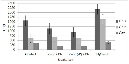 Leaves of pea seedlings grown in Knop (with and without P) with Pb ions exhibited reduction in chlorophyll a content compared with control seedlings (Figure 7). Growth in water and Pb(NO3)2 treatment increased the chlorophyll content significantly (about 70%, Figure 7). The plants treated with Pb ions showed lower chlorophyll a/b ratios than control plants (2.7) and was lowest (1.3) in plants grown in water with Pb. The plants grown in hydroponic cultures with Knop medium, in both variants (with and without phosphorus), contained less carotenoids relative to the control plants (Figure 7). Carotenoids (Car) were less affected by lead compared to chlorophyll (Chl); however, the Chl/Car ratio increased significantly after Pb treatment: 5.9 for control plants but approximately 10 for plants grown in water with Pb. Remote sensing indicators describing the content of chlorophyll (such as RARSa and RARSb; Table 6) also confirmed a decrease of about 35% (in the case of both indicators) between the growth environment, H2O + Pb, and control (Table 6). However, the amount of dyes, such as anthocyanins or carotenoids reflected by remote sensing vegetation indicators ARI1 and CRI1, also confirmed the fluorescence results. For the H2O + Pb growth environment, the difference in CRI1 was 47% and 575 for ARI1 compared with the control.