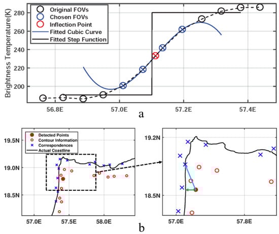 The estimation of coastline point and determination of geolocation error based on the CIM. (a) the estimation of coastline point. Black circles are the original FOVs, blue line denotes the fitted cubic curve based on the four chosen FOVs (blue circles), the inflection point of cubic curve is the estimated coastline point denoted as red circle, and black line denotes the step function that is the assumption of the -ICP CIM algorithm; (b) the determination of geolocation error. The red solid point denotes the detected coastline point, red hollow points are the edge information near the detected coastline point, and blue forks denote the correspondences between red hollow points and actual coastline. In the -ICP CIM, the geolocation error is set to be the distance between the estimated coastline point and its corresponding point, i.e., blue arrow in the right enlarged image. In the CIM, the geolocation error is set to be the vertical distance between the estimated coastline point and the actual coastline, i.e., green arrow in the right enlarged image.