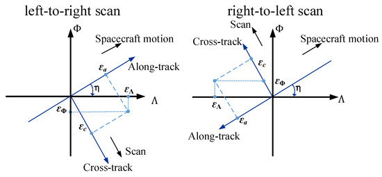 where , , , , represent the spacecraft heading angle, cross-track error, along-track error, longitude error and latitude error, respectively. The upper sign ‘+’ in Equation (21) is used when the scan direction is left to right; otherwise, the lower sign ‘−’ is used. The transformation from latitude and longitude coordinates to cross-track and along-track coordinates is also shown in Figure 2.
