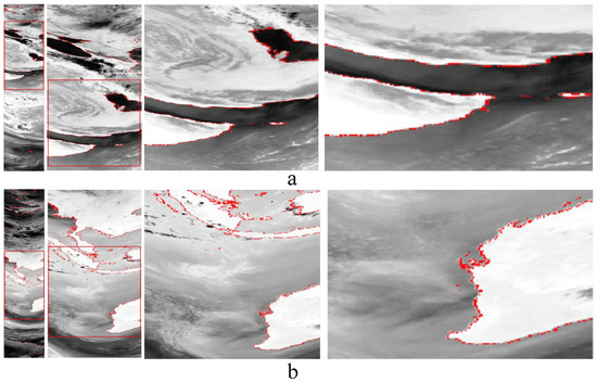 - When there is no obvious noise, the difference between the coastline points located by sparse regularization optimization model and located by CIM is not obvious (which is natural because they are all sub-pixel level operations), and the difference between the geolocation error estimated by -ICP CIM and CIM is mainly reflected in the process of finding corresponding point.
