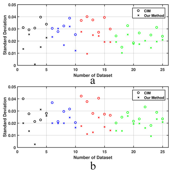 Figure 5 shows the standard deviations of the cross- and along-track errors of 25 selected MWRI data (as shown in Table 2), respectively. In Figure 5, the circle represents the standard deviation of the geolocation error estimated by -ICP CIM, and the fork represents the standard deviation of the geolocation error estimated by CIM. It is clear that the standard deviation of the geolocation errors obtained by -ICP CIM is much lower than that of CIM: an average reduction of . It demonstrates that -ICP CIM is much more stable than CIM. The reasons are: