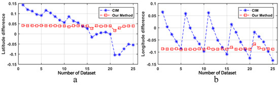 The difference between the mean of detection error and the given offset. (a) the first, second, third, fourth and fifth point correspond to the latitude difference in the case of longitude offset of −0.1, −0.05, 0, 0.05, 0.1, respectively; (b) the first, second, third, fourth and fifth point correspond to the longitude difference in the case of latitude offset of −0.1, −0.05, 0, 0.05, 0.1, respectively.