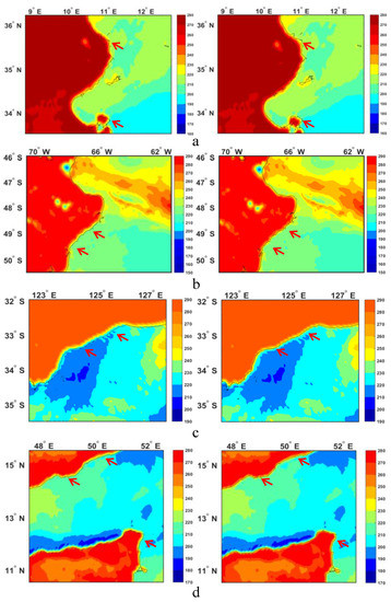 The MWRI brightness temperature distributions before (left) and after (right) correction. (a) Libyan coast; (b) South American coast; (c) Australia coast; (d) Arabian Peninsula coast.