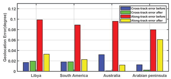 The quantitative results on the mean geolocation errors before and after correction are given in Figure 8. Blue and red bars denote the cross-track error and along-track error before the correction of geolocation errors, while green and yellow bars denote the cross-track error and along-track error after the correction, respectively. As shown, the geolocation errors are mainly concentrated in the along-track direction: the along-track errors of the four regions are between and , and the cross-track errors are about . After correction, the geolocation errors have been greatly reduced: in the along-track direction, the geolocation errors of Libya, South America and Australia have been significantly reduced, while that of the Arabian Peninsula is relatively small; in the cross-track direction, the geolocation errors of Australia and the Arabian Peninsula have been significantly reduced. Overall, the average geolocation error of each region was reduced by after correction. It demonstrates the superiority of -ICP CIM from a quantitative point of view.