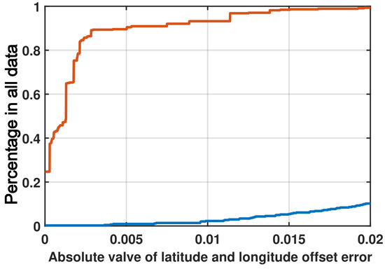 However, the estimated geolocation error’s accuracy is uncertain as the real geolocation error is usually unknown. In Section 3, we compare -ICP CIM with CIM using the strategy of artificially setting offsets on the original location data. In this section, we will continue to use this method to verify the accuracy of our algorithm. The error between the given and estimated latitude and longitude offsets is taken as the criterion to measure the accuracy of the algorithm. The small differences between them indicate a higher accuracy of -ICP CIM. In this section, the MWRI data over the coastal region of the Arabian Peninsula at 6:13 p.m. UTC 18 February 2016 is used in experiments. At the same time, we give the offset from to in longitude and latitude respectively in the unit of , so that we can get 441 pieces of error data. Figure 9 shows the absolute value of the estimated latitude and longitude offset error in a given range as a percentage of all data. The red line in Figure 9 represents -ICP CIM. As shown in Figure 9, the error of longitude and latitude offset estimated by -ICP CIM is very small, and most of the errors are less than . Specifically, about of the error is less than , of the error is less than , and of the error is less than . This shows that -ICP CIM can estimate the given offset accurately. At the same time, we estimate the accuracy of CIM in the same way. The result is shown by the blue line in Figure 9. It can be seen that the error of CIM is very large, and only about of the estimated offset error does not exceed . It shows that the accuracy of -ICP CIM is much higher than that of the CIM algorithm.