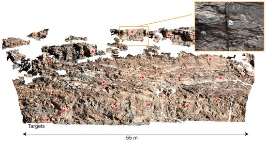Area of rock slope monitored using the 5-camera monitoring system. For comparison purposes, ground control points (targets) were installed on the monitored area (red stars and inset image).
