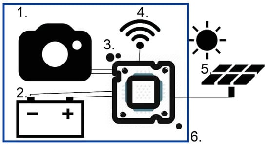 For indefinite data collection, the system needs to operate autonomously, have its own power supply, be protected from weather, and operate reliably in various weather conditions. The system used for this study consists of a camera and lens, a solar panel, an internal battery pack, a microcomputer controller, a wireless internet connection, and a weatherproof and tamperproof protective housing (Figure 3).