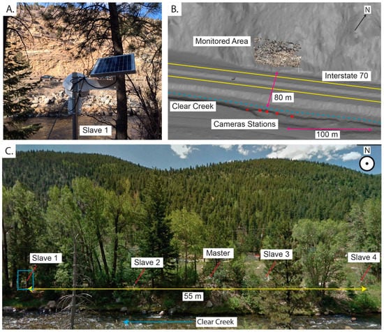 (A) Example of camera housing and solar panel installed on site overlooking monitored slope. (B) Digital Elevation Model of site showing camera locations, area of interest, Interstate 70, and clear creek. (C) Position of five camera stations on opposing side of Clear Creek.