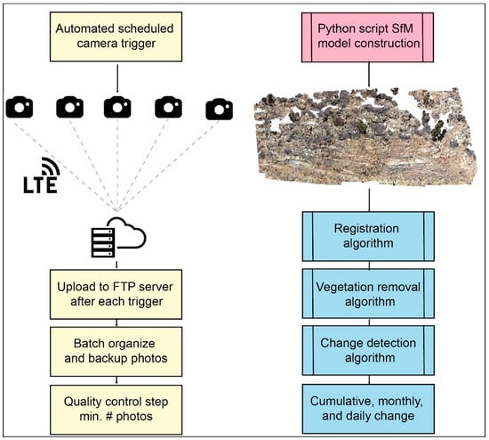 The automated data processing workflow consists of three components: (1) Schedule picture and upload of data; (2) SfM construction of 3D models; and (3) a registration and change detection pipeline (Figure 5). The workflow is designed for use to monitor an area without ground control points. The workflow requires some initial manual processing steps prior to initiating automation. This includes setting the schedule of pictures, providing a scaled and referenced SfM model as a reference for registration, and providing a classified point cloud with vegetation for vegetation removal. A detailed description of the three steps can be found in the following subsections.
