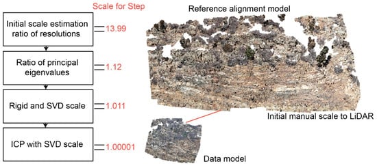 To get an initial rough estimation of scale, the similarity between subsequent point clouds is taken advantage of, and scale is estimated based on the ratio of resolutions of the reference alignment model and the aligned model. Since successive photogrammetric models are created using identical parameters, the resolutions of the models vary minimally, and any minor deviations depend primarily on the quality of the photos.