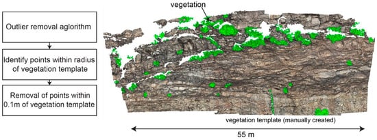 Following registration, vegetation is filtered from the aligned point cloud. To automate the vegetation removal, a template of vegetation points is first manually made from a series of 3D models of the site. The template consists of the subset of the total model points consisting of vegetation. The vegetation removal algorithm first removes outliers using a statistical outlier removal algorithm. The algorithm performs a statistical analysis on each point’s neighborhood distances and removes points that are outside 2 standard deviations of neighborhood distance. The nearest neighbors within a 0.1 m radius of each vegetation point are then found and removed from the point cloud. Figure 7 illustrates an example of the vegetation template and workflow for this step.