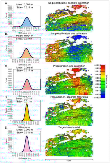 Figure 8 shows the comparison between TLS and five different SfM model constructions: (1) No pre-calibration with separate calibration parameters for each camera; (2) no pre-calibration with one calibration group for all cameras: (3) pre-calibration with one calibration group for all camera; (4) pre-calibration with separate calibration parameters for each camera; (5) a model constructed using ground control. The figure shows the resulting differences as histograms and spatially distributed over the comparison area for qualitative assessment of accuracy.