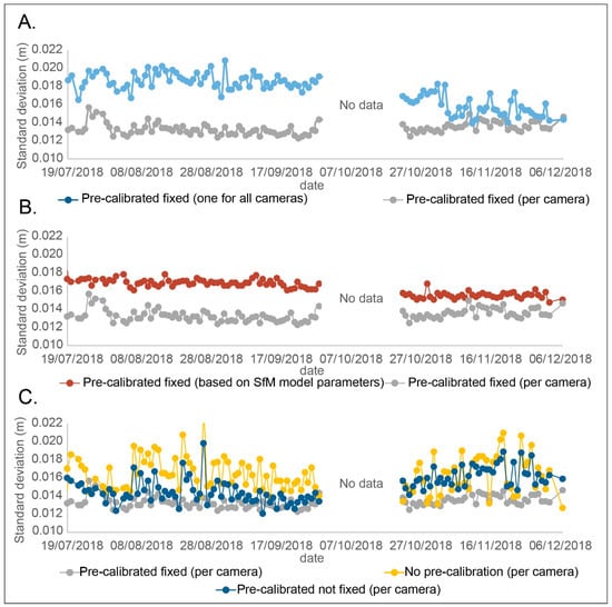The second comparison (B) (Figure 9, Inset B) shows the difference between using separate fixed pre-calibration parameters for each camera station and using separate fixed pre-calibration where the parameters were obtained from a previous SfM model construction. The pre-calibration parameters were obtained by extracting the intrinsic camera parameters of a well-constructed SfM model of the site. The average standard deviation for the pre-calibration from the SfM model was 0.16 m. The pre-calibration based on a SfM model was less accurate than the pre-calibrated case, however, both cases maintained similar precision. The standard deviation of the comparison standard deviations over the time period were 0.0006 m and 0.0008 m for the pre-calibrated fixed models and pre-calibrated fixed model with pre-calibration from a SfM model, respectively.
