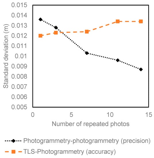 Models generated from a fixed network of cameras are produced from a lower number of positions than a traditional terrestrial data collection where one camera can be easily moved to multiple different locations. As result, models are constructed with a low number of photos. To test if increasing the number of photos per station had a positive effect on precision and accuracy of the models in a fixed setup, SfM models were constructed with varying numbers of repeated photos throughout two consecutive days. To estimate precision, models constructed with varying numbers of repeated photos were compared between the two consecutive days. To estimate accuracy models constructed with varying numbers of repeated photos were compared to the TLS model (Figure 10). Models generated using a greater number of photos produced a better overall precision, however, the accuracy remained between 0.012 and 0.013 m. Although, increasing the number of photos didn’t improve overall accuracy, the combination of photos from different times of day did improve the number of tie points detected in areas obstructed by shadows in individual collections.