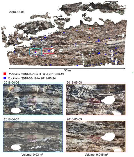 Change detection results were calculated using the pre-calibrated fixed case without ground control. The rockfalls were extracted from the change detection results and overlaid on the SfM model for comparison. Figure 11 shows the cumulative amount of rockfalls detected since the beginning of daily monitoring. The rockfalls colored in red highlight the rockfalls that occurred from the TLS baseline scan from 13 February 2018 to the start of photo monitoring on 19 March 2019. More than 50 fragmental rockfalls were detected ranging in size from 0.003 to 0.1 m3 between 13 February 2018 and 24 June 2019.