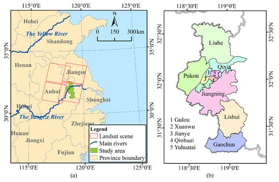 Study area: (a) the location of Nanjing in China and its corresponding Landsat scenes highlighted by pink rectangles. (b) The administrative units of Nanjing.