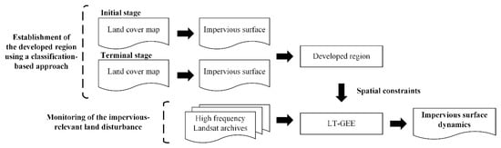 In this study, we suggest a new scheme to rapidly implement the long-term monitoring of impervious–relevant land disturbances at a regional scale and annual bias. This scheme aims to both improve the detection performance in heterogeneous backgrounds and reduce noises by combining spatial constraints with a temporally-dense detection method. Therefore, we sought to (1) establish the developed region using a classification-based approach; (2) employ LT-GEE and high temporal frequency Landsat archives, to capture the impervious–relevant land disturbances at a fine spatial resolution and annual bias; (3) derive the actual disturbances within the developed region and quantitatively evaluate the temporal–spatial accuracy of the results. A case study was conducted in Nanjing, China, to detect the impervious surface dynamics from 1988 to 2018.