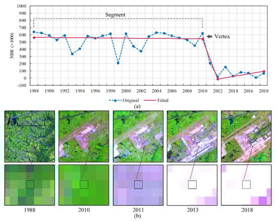 The spectral trajectory segment of GEE-based LandTrendr (LT-GEE). (a) A line chart with original Normalized Burn Ratio (NBR) values and corresponding fitted values in the selected point (Longitude: 118°52′16.86′′E, Latitude: 31°43′57.28′′N). (b) Different states of the selected point in the Landsat images. The land cover is changed by the Lukou airport’s extension in 2010. For Landsat TM/OLI images, the SWIR2, NIR, and Red bands are displayed as Red, Green, and Blue, respectively.