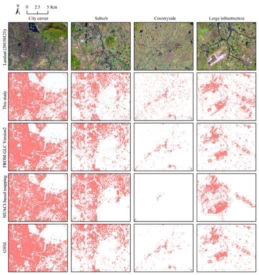Two kinds of open-access products were collected to compare against our detection results. These products include diverse global land cover maps and three statistical yearbooks. However, most of the global land cover maps were only mapped for one epoch. We collected these products as much as possible, including the Finer Resolution Observation and Monitoring of Global Land Cover (FROM-GLC) series products [,,,,], the high-resolution multi-temporal maps of global urban land [], and the Global Human Settlement Layers (GHSL) []. Moreover, the statistical data of built-up areas were extracted from three yearbooks [,,]. Product details are listed in Table A1.