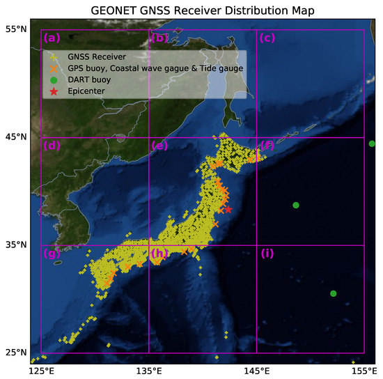 In this study, we use the GPS observation data to detect the ionospheric perturbations. The data come from the GEONET network which consists of about 1200 GPS stations densely distributed in Japan, see Figure 1 [17]. Note in the figure the location of the epicenter, and the partition of the stations in a 10° × 10° grid. This grid will be used for the local estimation of the properties of the TIDs. In addition, we use information from sea measurements to establish the relationship between the pattern of tsunami propagation and measures related to the response of the ionosphere. The data that records the tsunami wave along the coast is provided by the GPS buoys, coastal wave gauges and tide gauges deployed along the Japan coastline [18], and the recording for the tsunami wave in the deep ocean are from DART (i.e., the deep-ocean assessment and reporting of tsunamis) buoys [19], the location is marked with a color code in Figure 1. Note also that in the partitions (g), (h), (f) and (i), these sensors are present, and this will allow us to better contrast the measurements on sea with the measurements from the ionosphere.