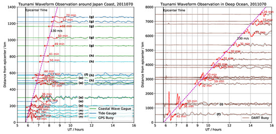 At the time of 05:46 UT, the Mw 9.1 earthquake occurred, under the shallow sea of about 32 km depth, located 70 km east of the pacific coast of Japan Tohoku, and the great tsunami with the height up to 40.5 m was triggered in the aftermath [29]. The tsunami waveform recordings from buoys are shown in Figure 3. These recordings were obtained from the GPS buoys, coastal wave gauges, tide gauges, and DART buoys surrounding the epicenter. The recordings show clearly that the triggered tsunami propagates with a low velocity (∼130 m/s) detected by the buoys near the shore, i.e., in shallow sea, and a components of medium velocity (∼230 m/s), detected by the buoys in deep ocean, see similar reports in Fujii et al. [30], Satake et al. [31]. From Figure 3 we measured that the period in the first cycles of the tsunami signal is greater in shallower areas of the sea than in deeper areas. The location of the buoys and the regions of shallow sea can be seen in Figure 1.