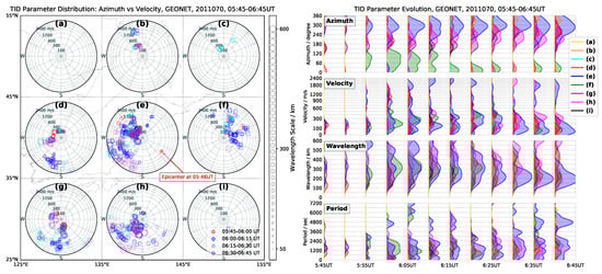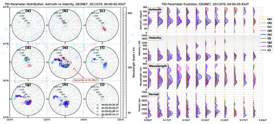 The ionospheric disturbances in the next two intervals, i.e., 04:30–05:00 UT and 05:00–05:30 UT (blue and cyan codes in left polar plots), show a significant signature, which are represented by the circles aligned westwards in subnetwork (e), (g), (h) and (f) of left Figure 4. This is also reflected in the histograms, where a clear mode of the azimuth appears at 300 degrees. But most significant feature, is the mode associated with the velocity. The maximum of this mode in the sequence of histograms, shows a linear trajectory in the logarithm scale (base two), i.e., exponential from 300 to 1000 m/s, which correspond to the westward trails that can be also seen in the polar plots. This signature of westward TIDs arises just after 04:00 UT and disappears at about 05:30 UT, with the amplitude of less than 0.1 TECU. This can be appreciated from the beginning as well, but before 04:30 UT is hidden by other detected TIDs with higher intensity and velocity. The histograms show that from the beginning, the signature appears with a low velocity and during the whole duration has a wavelength in the range of 50–120 km.