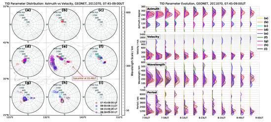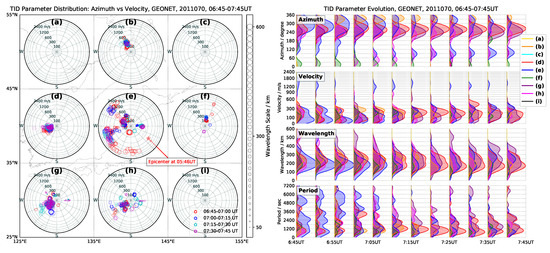 During the later phase, i.e., 06:45–09:00 UT, the fast TIDs diminish and disappear almost in all the subnetworks except (e), with a predominant azimuth of in the range of 240 to 270 degrees, see Figure 6 and Figure 7. Compared with the fast waves in the early moment after earthquake, there are fewer detected disturbances, and their intensity is much weaker. These might be related to the Rayleigh waves produced after the smaller subsequent aftershocks, for instance the ones at 06:59 UT (Mw 6.3), 07:15 UT (Mw 6.3), 07:29 UT (Mw 6.3) and 08:19 UT (Mw 6.5) [32]. Particularly in the polar-plot (e) of Figure 6, there is a set of high-speed perturbations with azimuth about 290 degrees (magenta circles), which is related to the aftershock at 08:19 UT (Mw 6.5). In the histograms related to the velocity, there is a small peak at 08:23 UT with speed of about 1200 m/s that increases to 1800 m/s in an exponential way (note the log scale of the plot). Moreover, the wavelength and period histograms of the fast waves during the whole periods concentrated at about 400–600 km and 100–300 s, respectively, which are consistent with Rolland et al. [10], Galvan et al. [13].