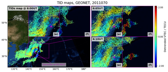 Detrended VTEC maps, at subnetworks (e) and (f), detrended by double difference of 300 s, from GEONET network, on the day 70 of 2011, for all the GPS satellites, at 06:00, 06:05, and 06:10 UT respectively. The ocean depth, obtained from the earth observatory of the U.S. NASA blue marble with topography and bathymetry.