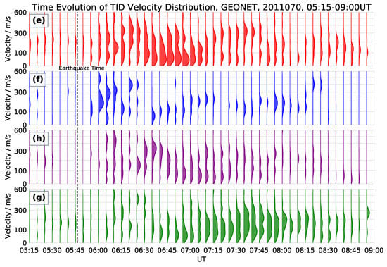 Time evolution of TID velocity distribution during 05:15–09:00 UT, for the subnetwork (e), (f), (h) and (g) respectively. The scale of the velocity axis ranges from 0 m/s to 600 m/s.