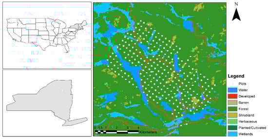 Location of Huntington Wildlife Forest in New York State. The figure shows the distribution of 270 forest inventory plots overlaid on land cover from the National Land Cover Database 2016 [].