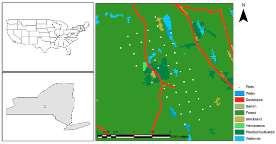 Location of Heiberg Memorial Forest in New York State. The figure shows the distribution of 43 forest inventory plots overlaid on land cover from the National Land Cover Database 2016 [].