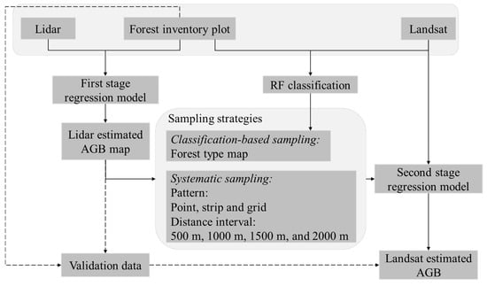We used AGB data developed from full lidar coverage as a baseline to see if Landsat-based AGB models that used lidar samples could achieve accuracies that approached that of models that used the more expensive full lidar coverage. We also sought to determine how accuracy varied with sampling strategy and if there was a way to establish a protocol to guide lidar sample collection. The workflow for this study is shown in Figure 3. The baseline for comparison in our study was an AGB model developed from the comprehensive lidar data coverage. Forest inventory plot and lidar data were applied to build a first stage regression model that was then used to estimate AGB for the Huntington study area. The impact of different lidar sampling strategies was explored using second stage regression models, which established a relationship between samples of the lidar estimated AGB values and Landsat derived variables. Two categories of lidar sampling strategies were explored: Systematic sampling and classification-based sampling. The classification-based sampling approach was based on a Random Forest (RF) forest type classification. A study previously performed at the same site found that RF had better performance in forest type classification than support vector machine and decision tree algorithms []. To assess the accuracy of different sampling strategies, Landsat estimated AGB values generated from second stage regression models were validated using plot and lidar estimated AGB values using mean absolute error (MAE), root mean square error (RMSE), and relative root mean square error (RRMSE). Lidar estimated AGB values covering the full study area were estimated using the first stage regression model and used for testing the Landsat estimated AGB values.