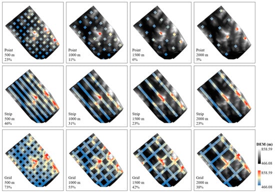 Distribution of lidar samples generated from twelve systematic lidar sampling strategies. Each sampling strategy had a unique combination of sampling pattern, distance interval, and the percentage of the sampled area as indicated in the lower left corner of each panel. Sampled area is shown in color on top of the greyscale digital elevation model.