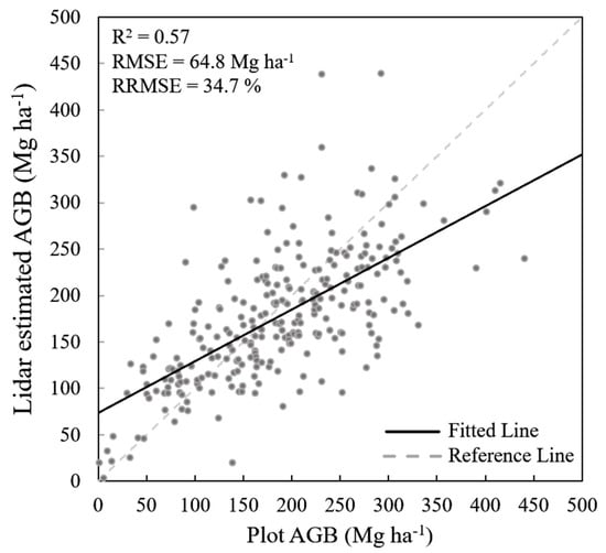 Huntington forest inventory plots and lidar derived variables were applied to establish the first stage regression model, which was validated using a 10-fold cross validation. The regression equation for the final model selected is shown in Equation (6). This equation shows the two variables selected through the forward variable selection process: ht-P90 (90th percentile of lidar point heights) and Per-first-mean (percentage of first returns above mean return height within each plot). The model has an R2 of 0.57, RMSE of 64.8 Mg ha−1, and RRMSE of 34.7% from the 10-fold cross-validation. Figure 5 shows a scatter plot illustrating the relationship between the field-based plot AGB and the lidar estimated AGB for the Huntington site.