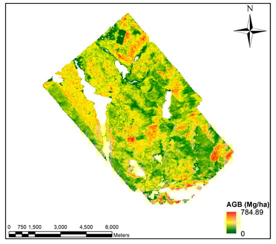 Raster layers of ht_P90 and Per_first_mean covering the whole area were created from the lidar point data. A cell size of 30 m was adopted for both raster layers to be consistent with the Landsat spatial resolution. The two raster layers were then applied in Equation (6) to generate a lidar estimated AGB map for Huntington (Figure 6). Lidar estimated AGB values at Huntington ranged from 0 to 784.89 Mg ha−1 with less than 0.3% of pixel values beyond the plot AGB maximum value of 440.3 Mg ha−1.