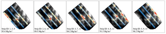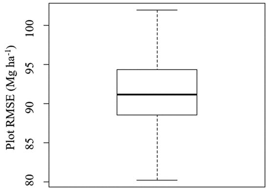 Given the variability shown in these five alternatives, we also explored the variability based on a random selection of 3 of the 13 non-overlapping strips available for this property. This led to a total of 286 combinations, with plot-based RMSE values summarized in Figure 8. The plot-based RMSE values that came from randomly selecting three strips ranged from 80.1 to 102.0 Mg ha−1.