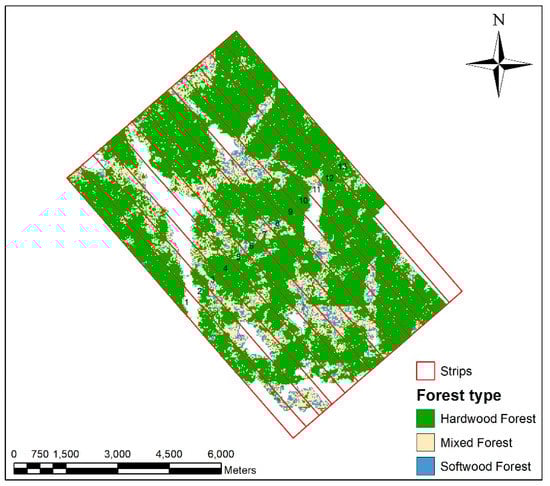 The second sampling approach explored a classification-based framework. We used a strip sampling structure at 1500 m distance intervals to select three strips from the forest type map. The forest type map was generated from the Landsat data using an RF classification with an out-of-bag (OBB) error rate of 18.9%. As with the systematic sampling, the Huntington study site was covered with 13,500 m wide non-overlapping strips. The distribution of strips and strip IDs are shown in Figure 9.