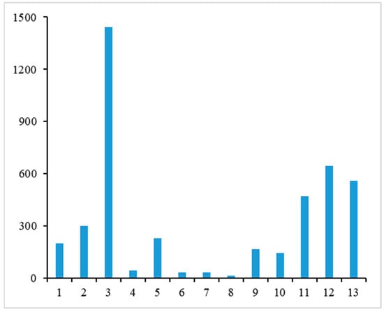 Chi-square values between the full coverage and each strip in terms of forest type frequency. The X axis is strip ID and the Y axis is chi-square goodness of fit value.