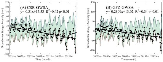 The monthly GWSA derived from the four GRACE datasets show significant decreasing trends at the 99% significance level (p < 0.01) with the rates between −0.27 ± 0.06 mm/a and −0.31 ± 0.06 mm/a, which clearly indicates groundwater depletion in Xinjiang during 2003–2016 (Figure 4 and Table 2). For the intra-annual changes of GWSA, the anomalies of April to August are positive, while those in other months are negative (Figure 5A). The average of GWSA decreases month-to-month from August to October, and then increases till April. A similar month-to-month variation is founded in the linear trends (k) of the monthly GWSA (Figure 5B). GWSA in all the months have negative trends with the most considerable decreases in September and October.