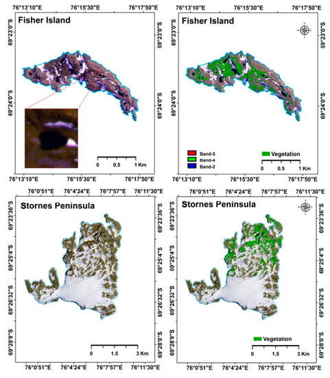 In terms of accuracy assessment based on manually digitized reference vegetation data (supplemented with ground truth data), the NDVI-2 (bias: Fisher Island = 14,950.85 m2, Stornes Peninsula = 167,790.95 m2) combination yielded superior results, while NDVI-1 (bias: Fisher Island = 16,107.10 m2, Stornes Peninsula = 311,774.22 m2) performing the worst, when compared to the remaining two combinations (Table 4 and Table 5).