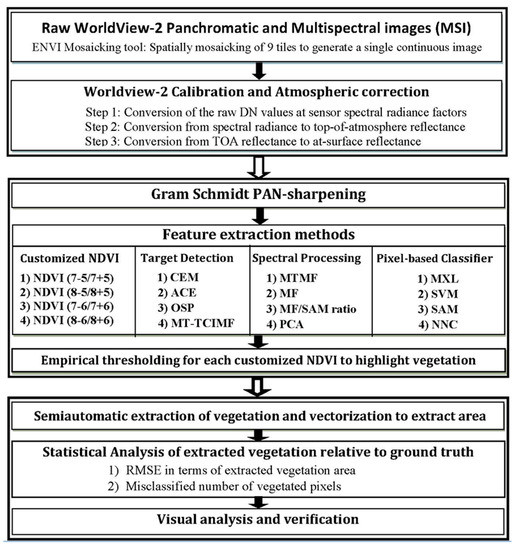 This procedure consisted of four semi-automatic feature extraction approaches: (a) customized NDVI, (b) spectral processing or matching, (c) target detection, and (d) pixel-wise supervised classification. All satellite data were processed by procedures developed using ENVI 5 software.