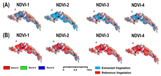 Visual analysis of semi-automatically extracted vegetation (blue coloured) against the manually digitized reference vegetation (red colored) using Normalized Difference Vegetation Index (NDVI) approach. (A) Semi-automatically extracted vegetation is overlaid on manually digitized reference vegetation to highlight spatial distribution of underestimated vegetated areas. (B) Manually digitized reference vegetation overlaid on the semi-automatically extracted vegetation to highlight spatial distribution of overestimated vegetated areas. All the displayed maps are prepared using Band-5 (630–690 nm), Band-4 (585–625 nm), and Band-2 (450–510 nm) of WV-2 imagery.