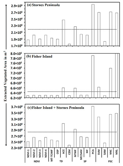 The overall performance trend for all vegetation extraction methods grouped in three approaches [Target detection (TD), Spectral processing approach (SP) and pixel-wise supervised classification approach (PSC)], in terms of extracted vegetation area (m2) of (a) Fisher Island) (b) Stornes Peninsula and (c) Fisher Island + Stornes Peninsula with reference to manual digitization supplemented by ground-truthing. The black dotted line highlights the reference vegetated area.