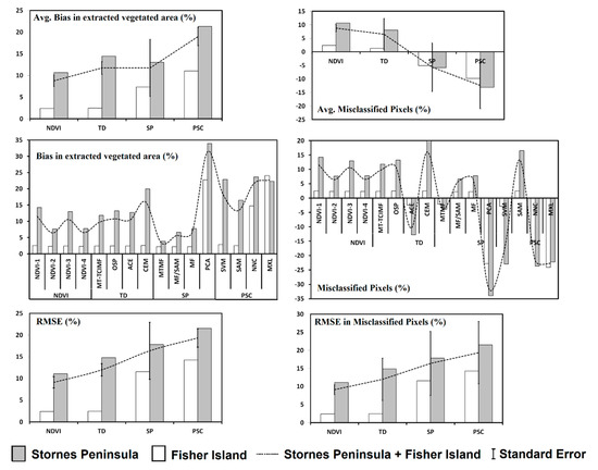 However, the differences in bias for NDVI-3 (Fisher Island = 15,518.06 m2, Stornes Peninsula = 284,756.52 m2) and NDVI-1 were comparable in the group of four NDVIs. Similarly, the performance of NDVI-4 (bias: Fisher Island = 15,093.41 m2, Stornes Peninsula = 170,286.70 m2) and NDVI-2 were similar. NDVI-2 (total misclassified pixels = 6.44 ± 1.34%) and NDVI-4 (total misclassified pixels = 6.53 ± 1.34%) yielded ~2 times better results than NDVI-1 (total misclassified pixels = 11.55 ± 1.34%) and NDVI-3 (total misclassified pixels = 10.58 ± 1.34%) (Table 4 and Table 5).