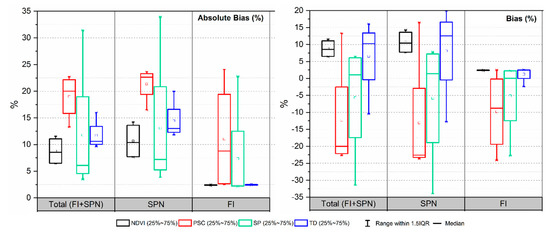 Box plots showing variation in % bias (absolute bias and bias) values pertaining to extracted vegetation from Fisher Island (FI) and Stornes Peninsula (SPN) with reference to vegetated area for four [Target detection (TD), Spectral processing approach (SP), and pixel-wise supervised classification approach (PSC)] practiced feature extraction approaches.