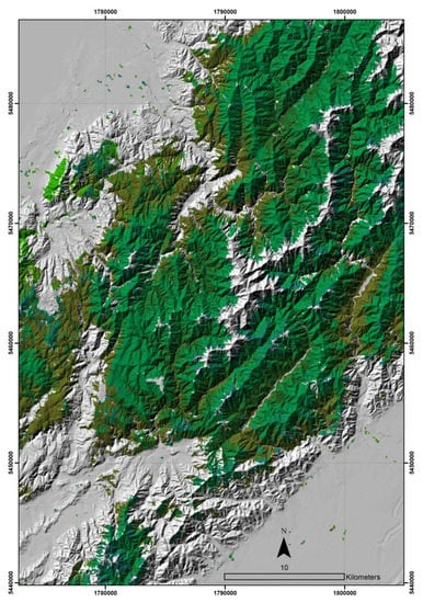 - Dymond, J.R.; Shepherd, J.D. The spatial distribution of indigenous forest and its composition in the Wellington region, New Zealand, from ETM+ satellite imagery. Remote Sens. Environ. 2004, 90, 116–125. [Google Scholar] [CrossRef]