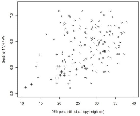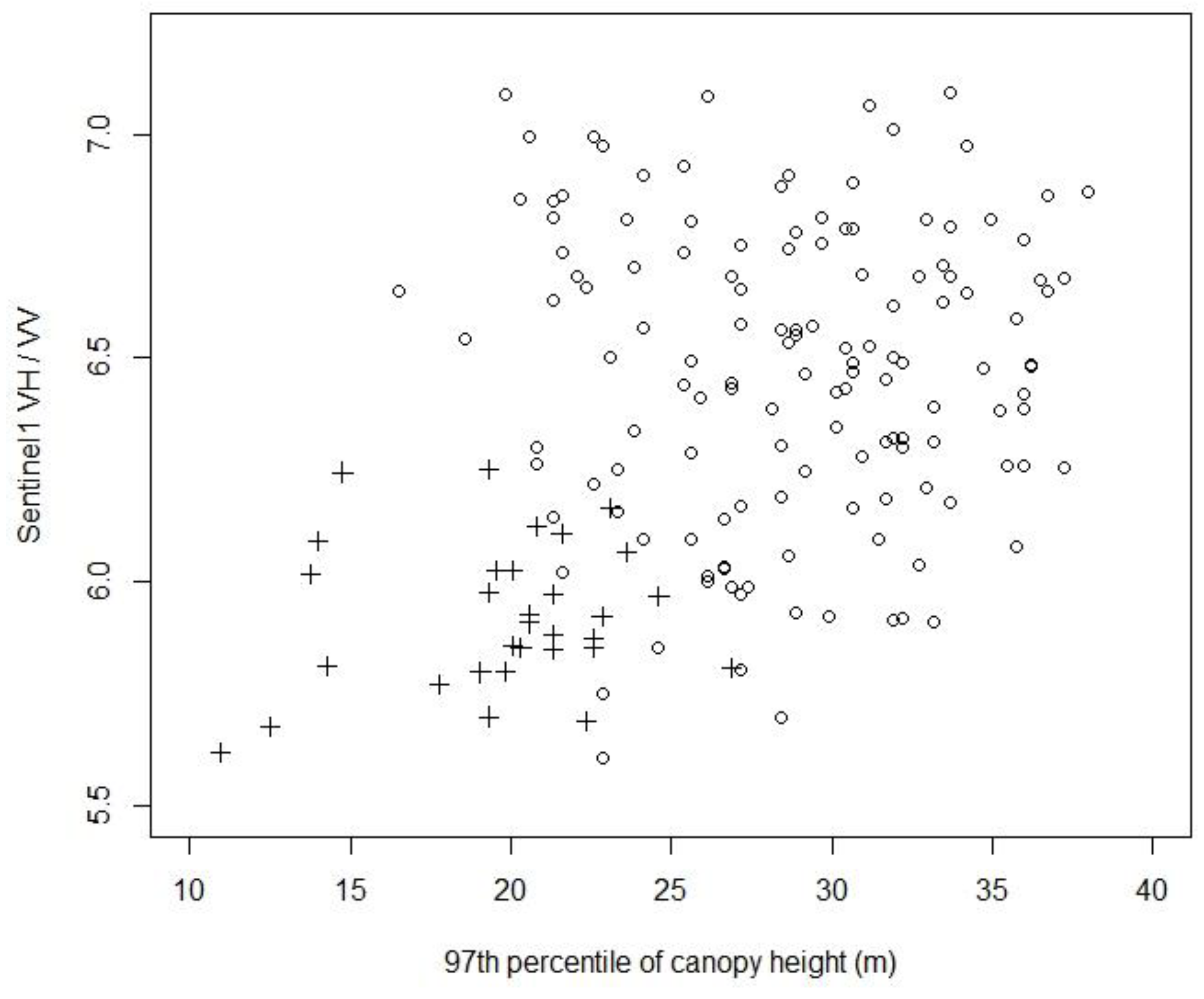 Plot of Sentinel-1 ratio of VH/VV versus 97th percentile of canopy height for Beech forest (crosses) and Broadleaved-podocarp forest (circles).